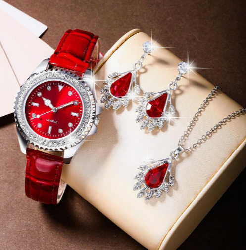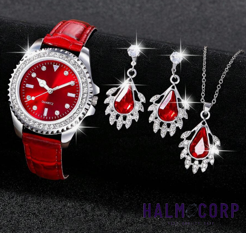 Tento elegantný dámsky set v červenej farbe obsahuje štýlové hodinky, prívesok na krk a náušnice, ktoré sa návzajom perfektne dopĺňajú.