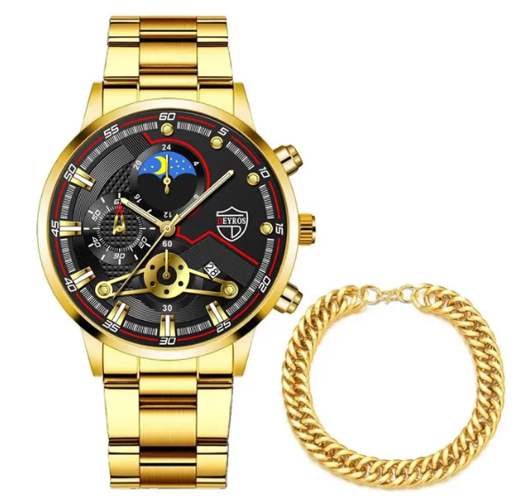 Štýlový pánsky čierno-zlatý set, ktorý spája moderný dizajn s eleganciou. Tento set obsahuje kvalitný náramok na ruku, ktorý je vyrobený v zlatej farbe.