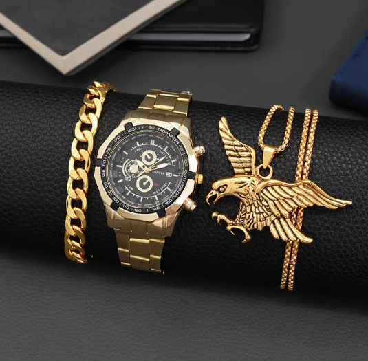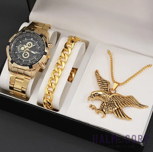 Štýlový pánsky set Geneva s unikátnym dizajnom orla, ktorý vyžaruje silu a eleganciu. Tento set zahŕňa kvalitné hodinky s výrazným ciferníkom.